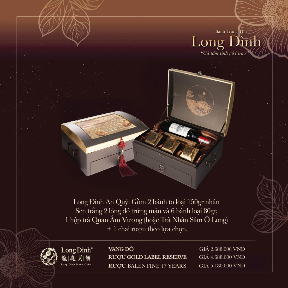 Hộp gồm: 2 bánh x 150gr (sen trứng 2 lòng đỏ trứng mặn) + 6 bánh x 80gr + 1 hộp trà Quan Âm Vương / trà Nhân Sâm Ô Long + 1 chai rượu theo lựa chọn